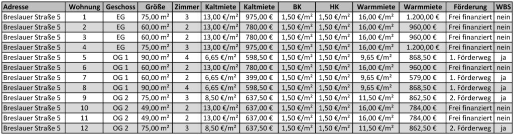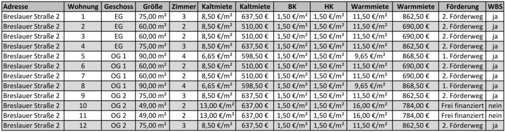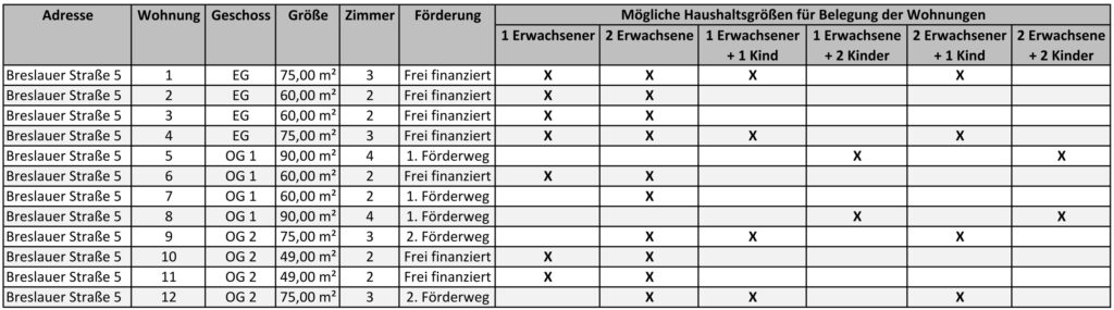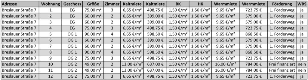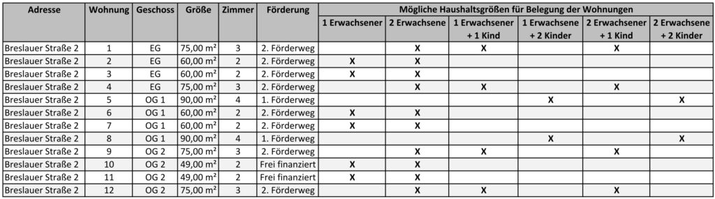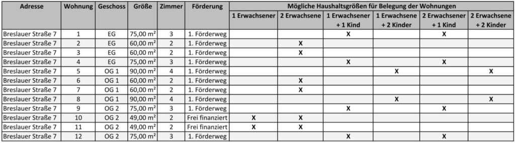 Nachfolgend finden Sie die Mietpreise und die Belegungsmöglichkeiten für die 36 Wohnungen, die in den drei baugleichen Häusern mit jeweils 12 Wohnungen in der Breslauer Straße 2, 5, 7 in Husum entstehen.